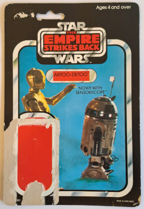 The Palitoy factory ran out of Palitoy 45B cards for some of it's figures and used German General Mills cards instead. The card has a Palitoy sticker covering the entire bottom half of the reverse of the card to cover up the German writing. This sticker has the same text as on the back of the bottom half of the Palitoy 45C variation. This sticker has only been seen on R2-D2 (With Sensorscope) and is known as 45BA on the Palitoy matrix.